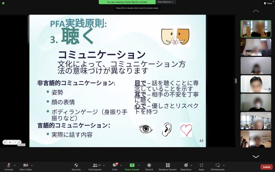 メンタルヘルスのワークショップを通じて、新たに来日したウクライナ人に支援情報を提供しながら、彼らのメンタルヘルスのニーズをサポートしました。被災者(避難民)をサポートする人たちに、ネガティブな影響や二次的トラウマを減らすための心理的ファーストエイド(救急法)のトレーニングを行いました。ボランティアを募り、ウクライナ人の受け入れを支援する地域の多くのメンバーと連絡を取り、2022年4月から9月にかけて合計5つの心理的応急手当セッションを開催しました。