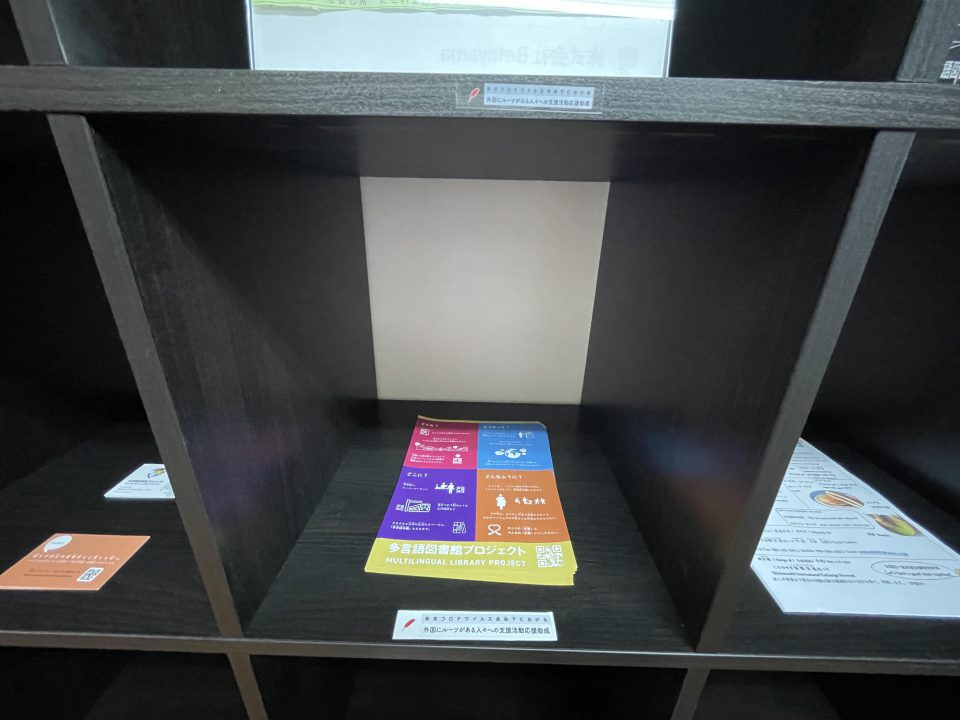 ④では、本棚のスペースにどのような情報を掲示するかを検討し、外国人支援団体への相談窓口の情報を掲示しました。掲示した情報は山口県国際交流協会が提供しているもの、東京都大田区の一般社団法人レガートおおたが提供している全国対象のものの2種類です。