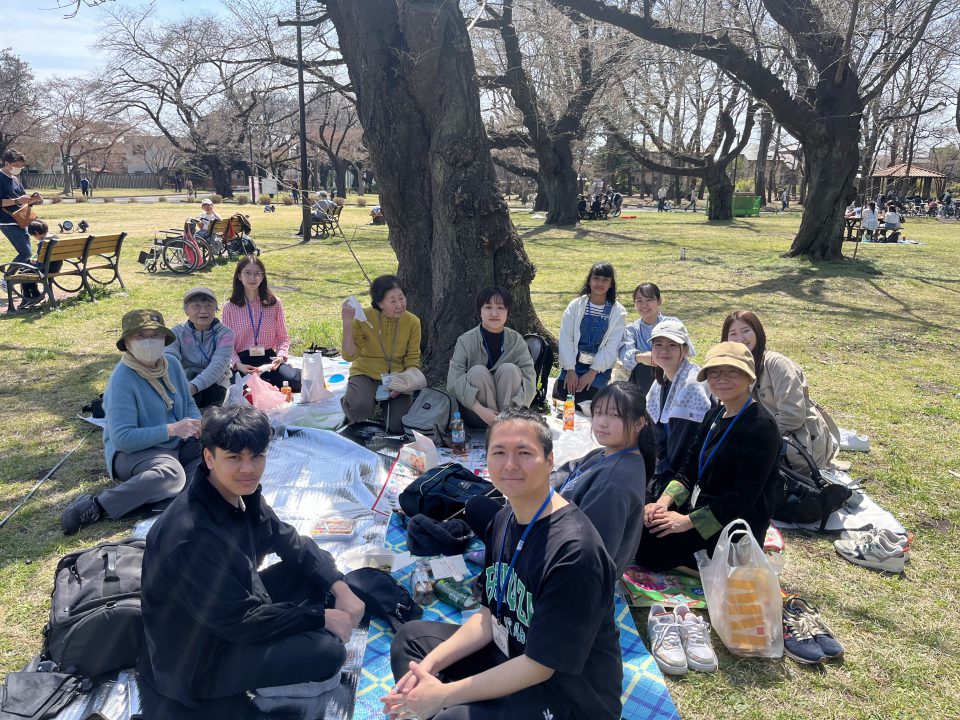 ・3月30日(土)小金井公園でお花見・江戸東京たてもの園への外出プログラム みんなでお花見ピクニックと江戸東京たてもの園で日本の古い家や街並みなどを見て回り、それぞれの文化の相違点をボランティアと話しながら過ごした。