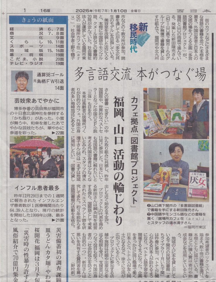 ①下関市、宇部市より情報提供を受けました。また田中雅子氏の協力の元、地域のネパール人についての調査を行いました。多言語本棚を設置している各拠点で情報交換を密にし、外国にルーツのある人や外国語に通じた人たちに適宜対応することができました。