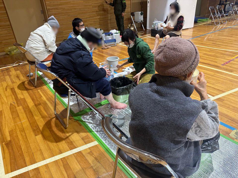 1月6日から3月末まで、石川県七尾市中島町の小牧集会所を拠点として、周辺の被災自治体(穴水町、輪島市、能登町、珠洲市、門前町など)にて被災された方々を対象に、避難所や在宅を関係団体と連携をしながら断水が続く状況下において必要な物資についての情報収集・整理・運搬・配布、また随時スタッフを現地に派遣しながら各避難所においての足湯マッサージや炊き出し、環境改善などのサービスを提供した。