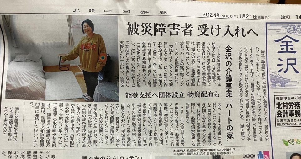 北陸中日新聞に支援活動が掲載されたことがきっかけに広く石川県民の方に届き問い合わせあり。特に障害者支援者から「何か私たちにもできることはないか?」と支援の輪が広がった。