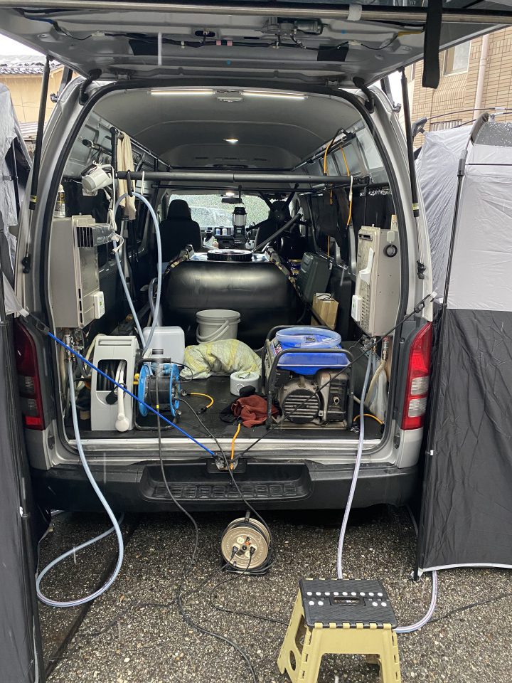 次のフェーズを予測した瓦礫撤去・屋根の応急処置や避難所環境支援(シャワー・洗濯)の準備に取り掛かるが、状況判断により避難所環境改善の即急な必要性を感じ救援物資運搬支援と並行して、支援準備を進める。