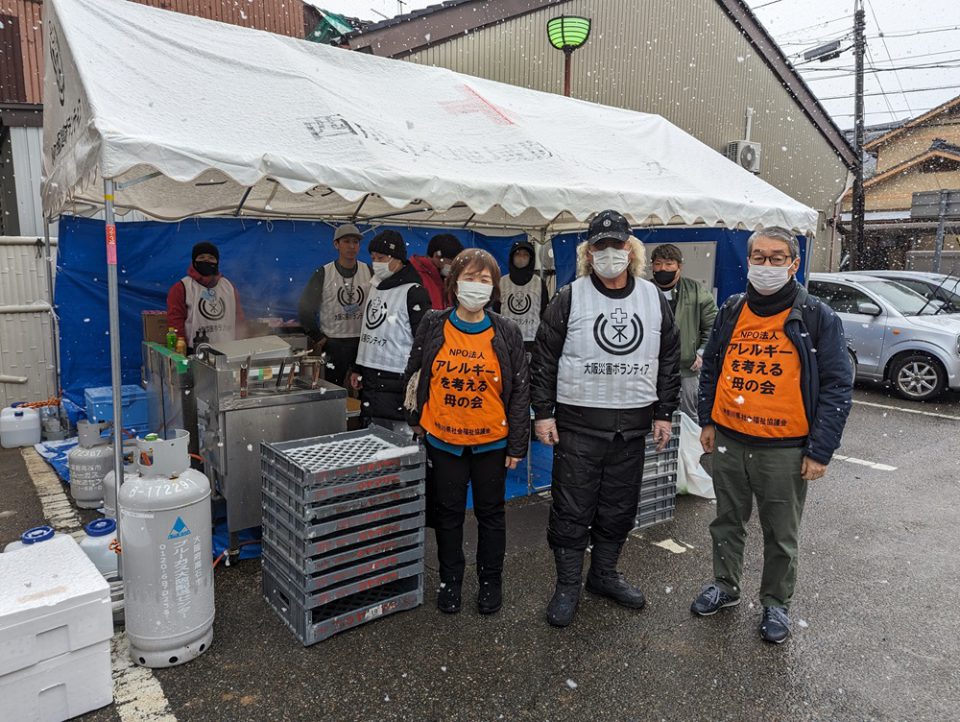 助成期間内に能登半島地震の被災地域を3回訪問し6日間活動した。活動開始に際し石川県庁に設置された保健医療調整本部と連絡を取ったところ「患者支援の申し出は大変にありがたい。ニーズが高まるのはもう少し時間がたってからではないか」(担当医師)とのことだった。発災2週間後の1月15日(月)、七尾市を訪れ被災者の健康を守る取り組みを担う市役所の健康推進課で情報交換と打ち合わせを行った後、矢田郷地区コミュニティセンターなど避難所7カ所で、アレルギー患者を支える体制づくりや相談窓口の案内、患者対応を行った。避難所で食事を提供しているボランティアグループとも交流し、食物アレルギー患者が食べられるか判断できるよう食事の原材料の表示を行うよう要請した。