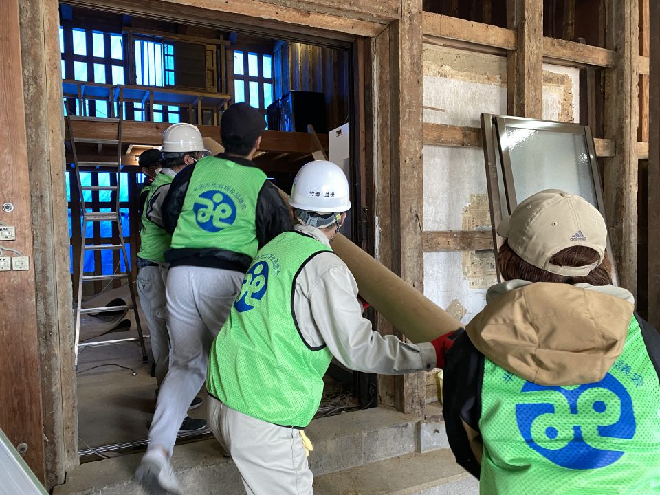 1班の活動先は、市民の方が所有する倉庫でした。地震により崩れてしまった倉庫内の土壁の修理のためスペースを確保する必要があり、家財の運び出しと屋根の上の土のう袋を下ろす作業を行いました。