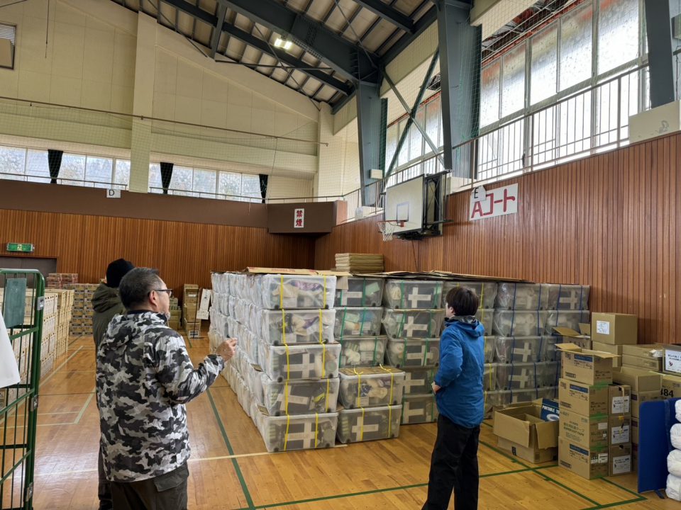 能登町では、仮設住宅の申し込みが613世帯とのことで、順次仮設住宅の建築が進められているが、完成まではまだ時間がかかる。鍵の引き渡しの日に生活用品が室内に届いていることが望ましいため、事前に能登町に届けておく必要がある。このため、能登町役場との協議の結果、柳田体育館での保管が決定した。2月29日に大阪の震災支援を続ける会が150セットを納入した際には、荷物の運搬を柳田体育館に駐在している自衛隊に手伝ってもらうなどし、連携がスムーズだったとの引継ぎを受け、当法人も3月7日に50個、21日に100個の搬入を行うことができた。