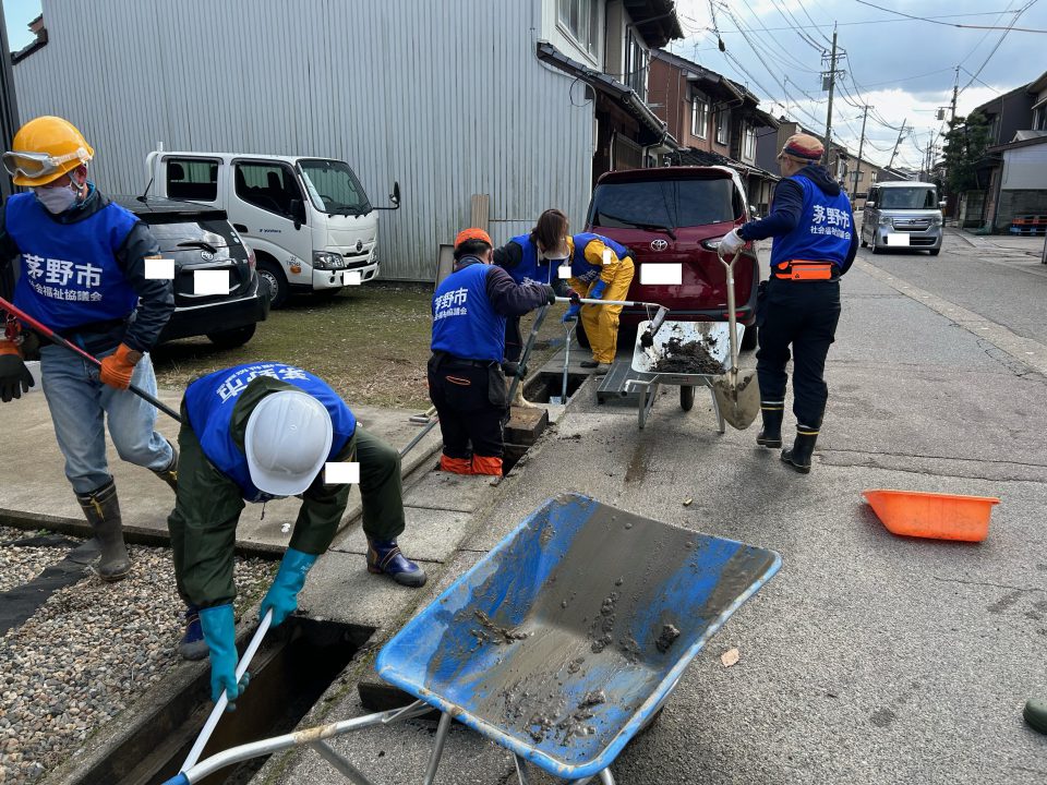 氷見市災害ボランティア・支えあいセンターと連携し、氷見市今町町内会にて、液状化により道路に流れた土砂の撤去や側溝の泥出しを町内会の方と協力しながら行いました。