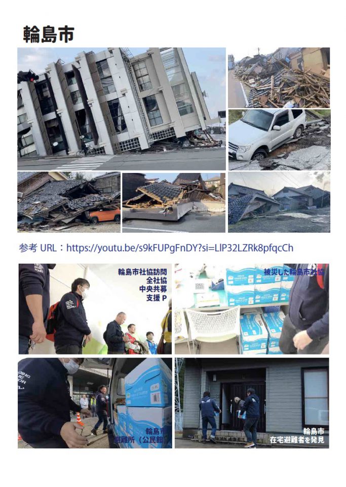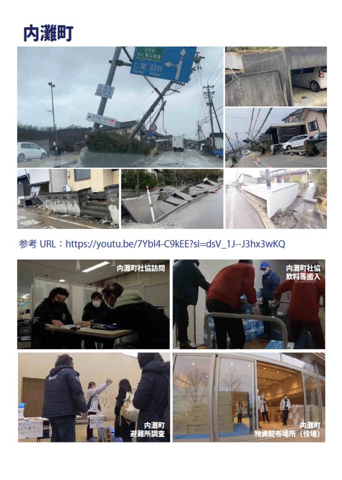 1/1-1/4 情報収集、情報発信 1/5-1/10 これまでの緊急期支援の経験をもとに必要と思われる物資を積み込み被災地へ ・石川県庁、石川県社協、JVOADを訪問。支援開始の報告と情報共有。 ・輪島市の避難所(2ヵ所):避難所へのプッシュ物資が滞っており、特に飲食料や衛生用品が不足。持参した物資を搬入。ニーズ把握。 ・輪島市社協:職員も被災しており社協に寝泊まり。電気、上下水道は使えない。飲食料、生活用品等の物資を搬入。ニーズ把握。 ・輪島市内で在宅避難者、車中避難者を発見し、物資を渡した。 ・輪島市門前町でビニールハウス内に避難していることを確認。ニーズ把握。 ・内灘町社協:飲料等物資を求められ、搬入。 ・加賀市社協:災害ボラセンをいち早く設置したが、被害はほぼない。 ・輪島市の避難所(すでに訪問したところ)より物資の追加要請あり、調達と準備。 ・内灘町役場:物資配布所にて求められた飲料、衛生用品を搬入。 ・各市町の被害状況を動画や写真で記録、共有(JVOADにも共有済み) ・火の国会議に参加、先遣の記録と現地の状況を共有。