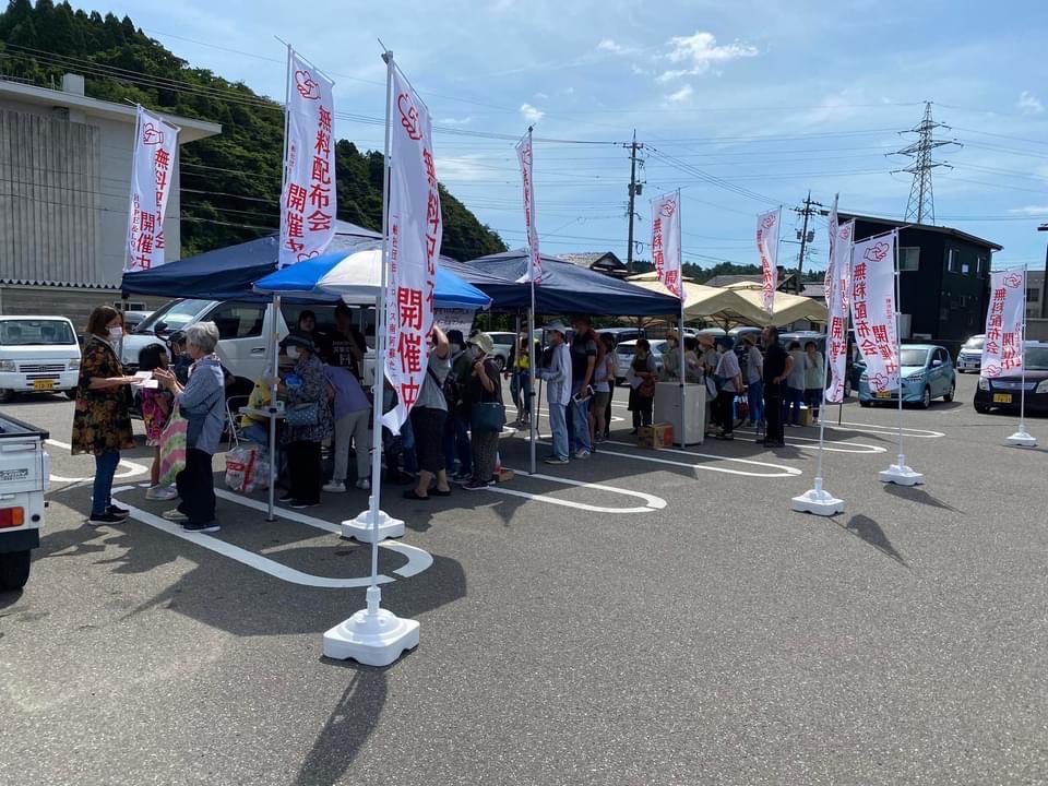 ・無料物資配布(穴水町で3回開催)※本来なら輪島や羽咋市等でも行いたかったのですが、開催初期、インフラの状態が悪く、穴水町は少し復旧して整っていた為、今回は穴水町での開催になりました。
