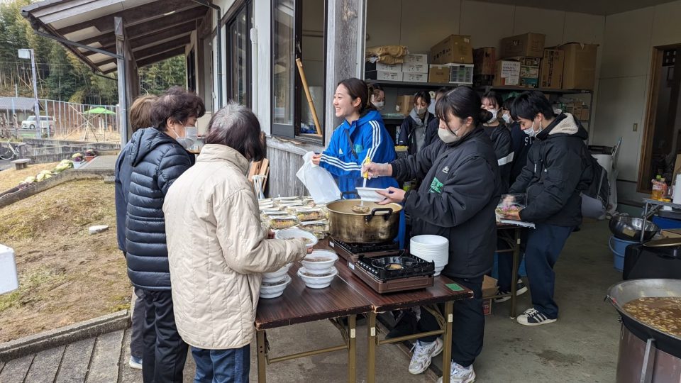 被災地へ赴き、家財の運び出しや瓦礫の撤去、炊き出し、避難所支援などを行った。家財の運び出し、瓦礫の撤去に関して、家屋・家財の損傷が激しかったことや広く大きな住居が大半だったため、居住している方だけでの片付けは困難な状況だった。そこへボランティアとして支援させていただくことで、住民の方の負担軽減につながったと感じる。しかし、肉体的な問題だけでなく、精神的な問題もある。被災前の暮らしができなくなったことによる精神的負担は大きなもので、心のケアをすることが重要であった。炊き出しではちらし寿司と芋煮を振る舞い、あたたかい食事を想像以上に多くの人に楽しんでいただき、少しでも日常を感じられる環境をつくることができた。さらに、活動拠点では連携先の被災地NGO協働センターと一般社団法人おもやいが行っている支援物資の配布の手伝いも行った。食材や日用品、洋服、ペット用品など様々なものがあり、住民の方々が自由に取っていく形で行われていた。この場所にはお茶のみスペースもあり、住民の方々からご家庭で過ごしたお話を聞いたり、同じ地震という災害を経験した福島の震災のお話をしたり、お子さんと遊んだりした。これらの活動を通して、肉体的な支援だけではなく、精神的なケアにもつながったと感じる。