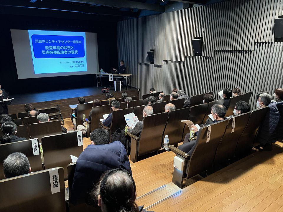 令和6年3月11日 防災ボランティア研修会にて報告 映画「星に語りて」上映後、1/5 から石川県で支援を続けている、ウェザーハート災害福祉事務所千川原公彦代表を講師に迎え、被災地の現状や要配慮者のことをお話いただきました。                                                   令和6年3月13日(水)~3月15日(金) ○活動場所 石川県輪島市釜屋谷町六字 30-4 地域生活支援ウミュードゥソラ(福祉避難所) ○活動団体 NPO 法人鶴岡災害ボランティアネットワーク 3名 ○活動内容 炊き出し だだちゃ豆たきこみごはん弁当、すまし汁 50食 ○寄附金 18,000円 (鶴岡市内のお店ケトルワンのお客さまからの募金) ○物 品 ケロちゃんタオル60枚 (ちょボラ場参加者が作成) 令和6年3月19日(火)~3月20日(水) ○活動場所 富山県氷見市中央町12-21 氷見市社協いきいき元気館(災害ボラセン拠点) ○活動団体 NPO 法人鶴岡災害ボランティアネットワーク 5名 ○活動内容 炊き出し 芋煮183食、玉こんにゃく113本 ○救援物資 ペットボトル水 500?×120本 (鶴岡市防災安全課より提供) ○寄附金 30,000円 (サンサービスよりイベント出店時の売上、他個人より)