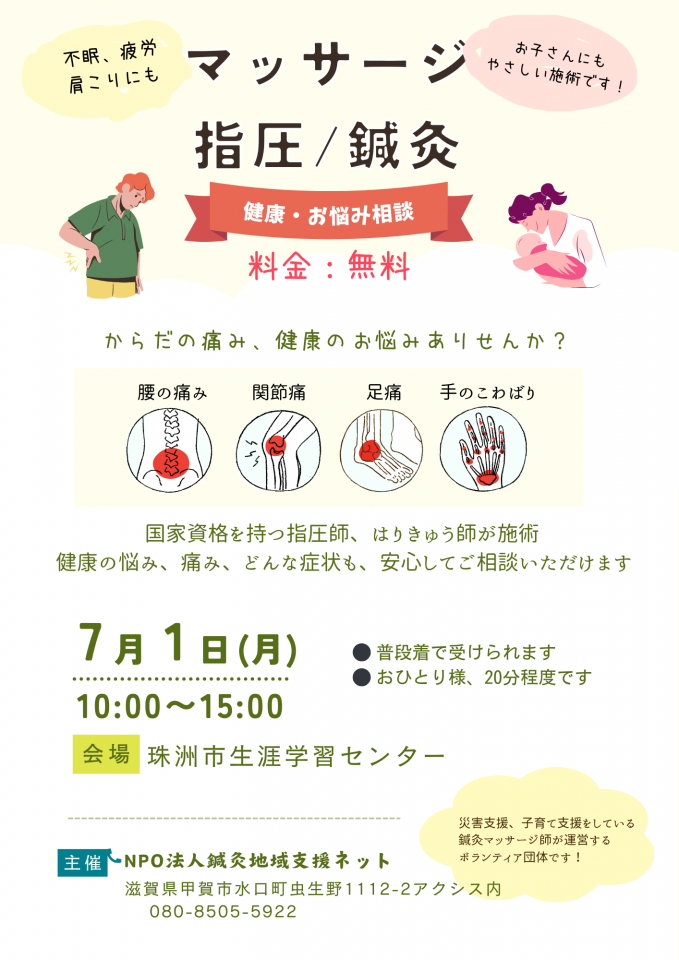 輪島市門前町と珠洲市にて、国家資格を有する鍼灸師、あん摩マッサージ指圧師による被災者に対する支援活動を行いました、私たちの施術を受療いただいた方々の殆どが70歳以上であり、地震の影響で高齢化、過疎化が加速してしまったことが伺え、車による移動に頼らざるを得ない環境で、住民の方々が互いを見守る中で、「痛みや疲れを癒す」活動を行ってきました。何度も、現地に足を運びながら、再受療を呼びかけてまいりました。受療カルテを作成し、記録簿とすることで、前回に受療してからの身体の変化などを確認、健康管理の一つとなるための活動としました。継続した活動によって、術者が気がかりに思える「受療者の不安感や愁訴」を抽出し、必要であれば、医療機関への受診を勧めたり、巡回保健師に連絡を取ったりと、鍼灸・マッサージ活動を行いながら、住民の方々の健康被害が大きくならないように配慮いたしました。