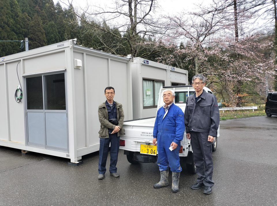 ア)春蘭の里応援ハウス(コンテナハウス)を設置して、ボランティアや地元住民の復旧活動の拠点として活用するとともに、支援団体の調整を行った。