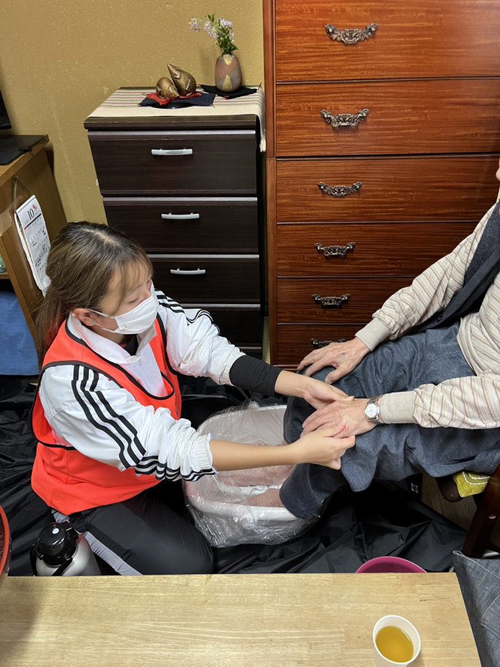 課題と今後の取り組みについて以下の2点が挙げられます。1 点目は訪問活動についてです。10 月から民間ボランティアセンター「おらっちゃ七尾」が開設されましたが、これをご存知でない住民が多くいらっしゃいます。また仮設住宅は住宅街から離れていることが多く、地域やボランティア活動に関する情報などが届きにくい現状もあります。この現状はニーズを発見できないだけでなく、相談場所が分からないことで苦しい気持ちを吐き出す場がないという住民さんの心のケアに対する課題にもつながります。これに対してsiensienwest の職員は おらっちゃ七尾の職務で多忙であることから、必要であると分かっていても訪問に行く時間を作れずにいます。活動中も「職員は来ないの?」と尋ねられることが多々あり、信頼関係のある人との交流を住民の方々が求めていることが判明しました。そのため、住民の心の支えや情報を手に入れる機会になる訪問活動が人手不足により十分に実施できていない点は今後の課題と考えています。そうしたなかで私達は毎月、活動を継続しているため今後も信頼関係を築きながら寄り添った支援を提供することが出来ます。そのため私達は課題に対して上記の利点を活かし、足湯を通した訪問活動を行うことで改善に努めます。2 点目はボランティア活動についてです。今回現場作業をするなかで「家財を捨てる前に再確認してくれる方は初めてで大切に扱ってくれていることがうれしかった。」という声をいただきました。これは今回の活動が住民の安心できる活動であっただけでなく、ボランティアに関わる人によって作業のムラが大きく、次回利用の意欲に影響することが考えられます。このことから、ボランティア同士が助け合い、高め合う環境が不足していることで住民のレジリエンス向上を妨げているという課題が考えられます。現地では初めてボランティア活動を行う方も多くいらっしゃいます。家財搬出の分別方法だけでなく、住民との関わり方についても手探り状態の方が多いのではないでしょうか。この課題に対して、現場作業等の経験を積んでいる私達が共に活動を行うことで、今までの活動で得た学びを共有し、住民が自身の復興作業を続ける意欲を高められる活動にできるように努めます。以上の2点が今後の課題とその取り組みです。私達は今後も上記の取り組みを被災地の状況に応じて柔軟かつ継続的に実施します。