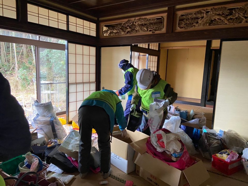 地震被害を受けたお宅から必要品の取り出し、災害ごみの運び出し。