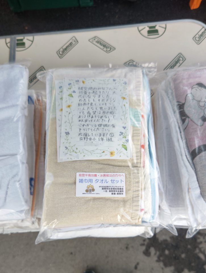 令和6年能登半島地震被災地への「たい焼き」を通じて被災地仮設住宅コミュニティー再生活動については、6月から取り組み今回は第2回目の活動である。9月に発生した集中豪雨災害に伴い被災地の状況は混沌としてきた。第2回目の活動は水害の被災地となった、輪島市町野町並びに門前町に入り2つの団地入居者の方を中心に周辺の自宅避難者に対して、焼きたての「たい焼き」を提供して元気と笑顔を取り戻してもらおうと計画して実施した。今回は座間市民に呼びかけて、タオル、雑巾、ウエス類を提供してもらい、これらをタオルパックとして各種タオルの詰め合わせセットを作った。その袋の中に座間市教育委員会の協力を受けて市内小中学生の有志から「応援メッセージカード」を封入してお渡ししました。この活動に連動して上部団体の公益社団法人SL災害救援ボランティアネットワークが石川県の承認を受けて行っている「ひゃくまんさん缶バッジ」募金で集まった募金を、輪島市社会福祉協議会様並びに中能登町社会福祉協議会様に「活動支援金」としてお渡した。