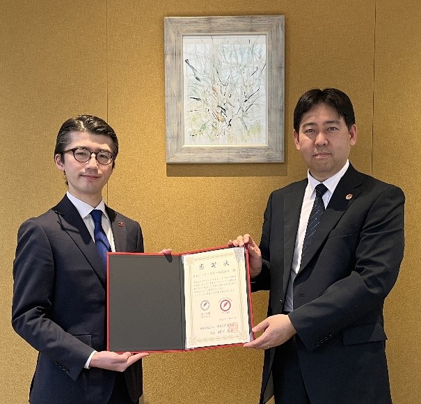 このほど、日本イーライリリー株式会社 コーポレート・アフェアーズ本部 企業広報部長 澤村 崇広様(写真左)へ、中央共同募金会 総務企画部長 山内 秀一郎(写真右)より感謝状を贈呈しました。