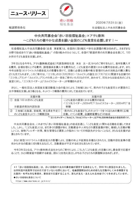 ホーム > お知らせ > 福祉基金 > 「赤い羽根福祉基金×アサヒ飲料」こどもたちの健やかな成長を願い全国のこども食堂を応援します! > 20200731ニュースリリース「赤い羽根福祉基金×アサヒ飲料」~全国のこども食堂を応援します!
