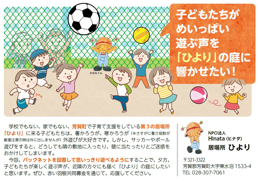 学校でも家でもない、芳賀町で子育て支援をしている第3の居場所「ひより」に来る子どもたちは、外遊びが大好きです。しかし、サッカーやボール遊びをすると隣の敷地に入るなど、ご迷惑を・・・。 ネットを設置して思いっきり遊べるようにすることで、楽しく遊ぶ声が、近隣の方々にも届く「ひより」の庭にしたいと思います。