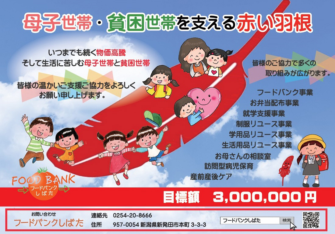 フードバンクシステム等の構築をもって地域の福祉向上に寄与します。フードバンク、お弁当配布、就学支援、訪問型病児保育、制服リュース・お母さんの相談室、産前産後ケア等を行い、貧困世帯および子育ての悩みを抱える人を包括的に支援します。