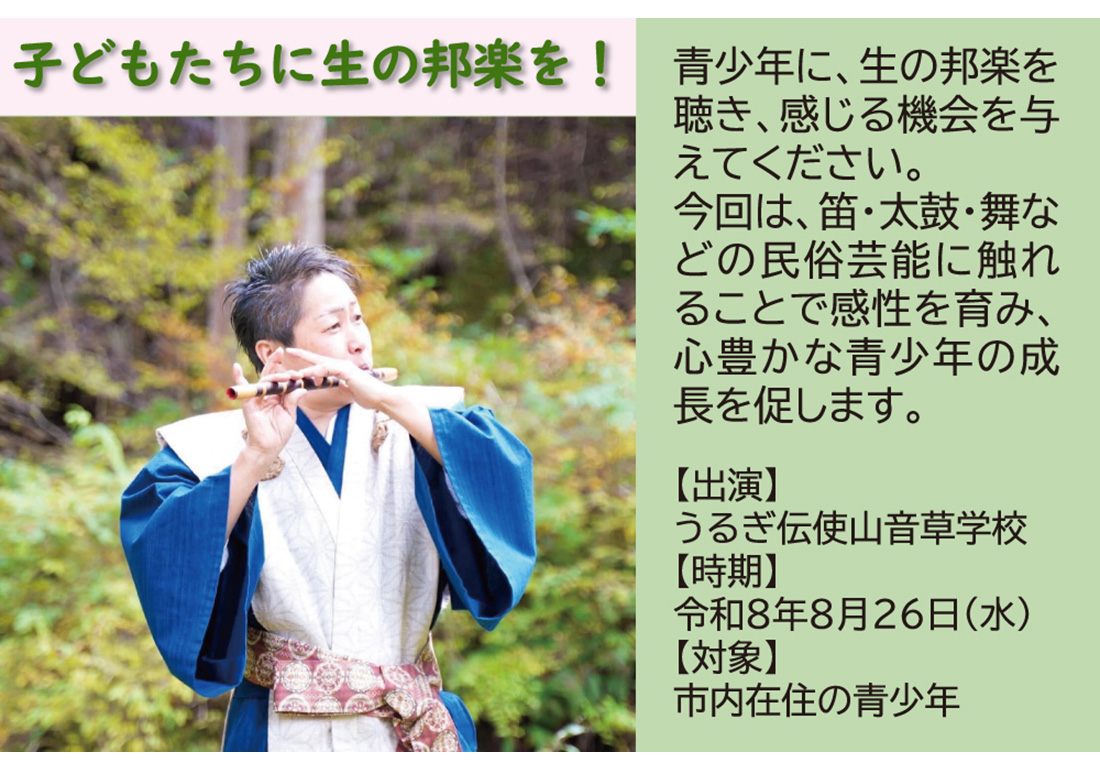 経済的、地域的な理由などにより、他所の人との関わりや、本物に触れる機会の少ないこどもたちに、日本の伝統芸能を鑑賞することを通して、伝統を伝える人たちの夢、努力を感じ、心の成長につなげていくことを目的として企画しました。是非とも応援してください。