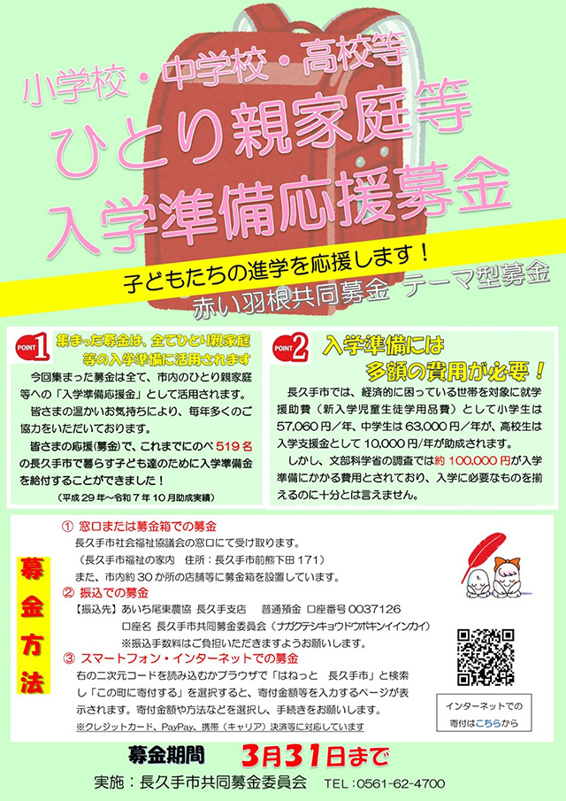 長久手市では、経済的にお困りの世帯を対象に就学援助費として小学生57,060円、中学生63,000円が、高校生は入学支援金で10,000円が年額で助成されますが、文科省の調査では約10万円が入学準備に必要とされています。そこで、「ひとり親家庭等の世帯」を支援するための募金を実施します。