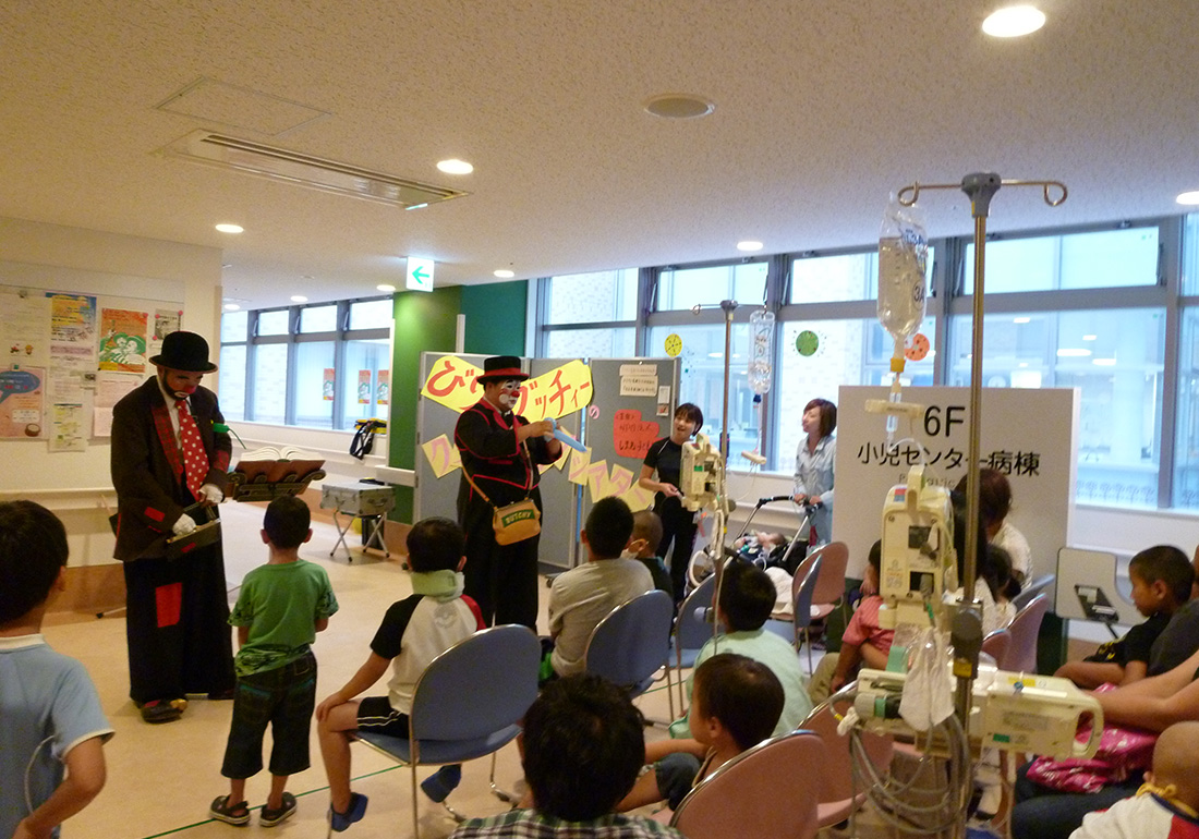 「ホッとアートプレゼント」は、病気と闘っている子どもたちに「笑顔」を届けるプロジェクトです。プロのクラウンや人形劇、マジックなど、子どもたちがわくわく夢中になれる質の高い作品を、小児科病棟へ無料で届けています。